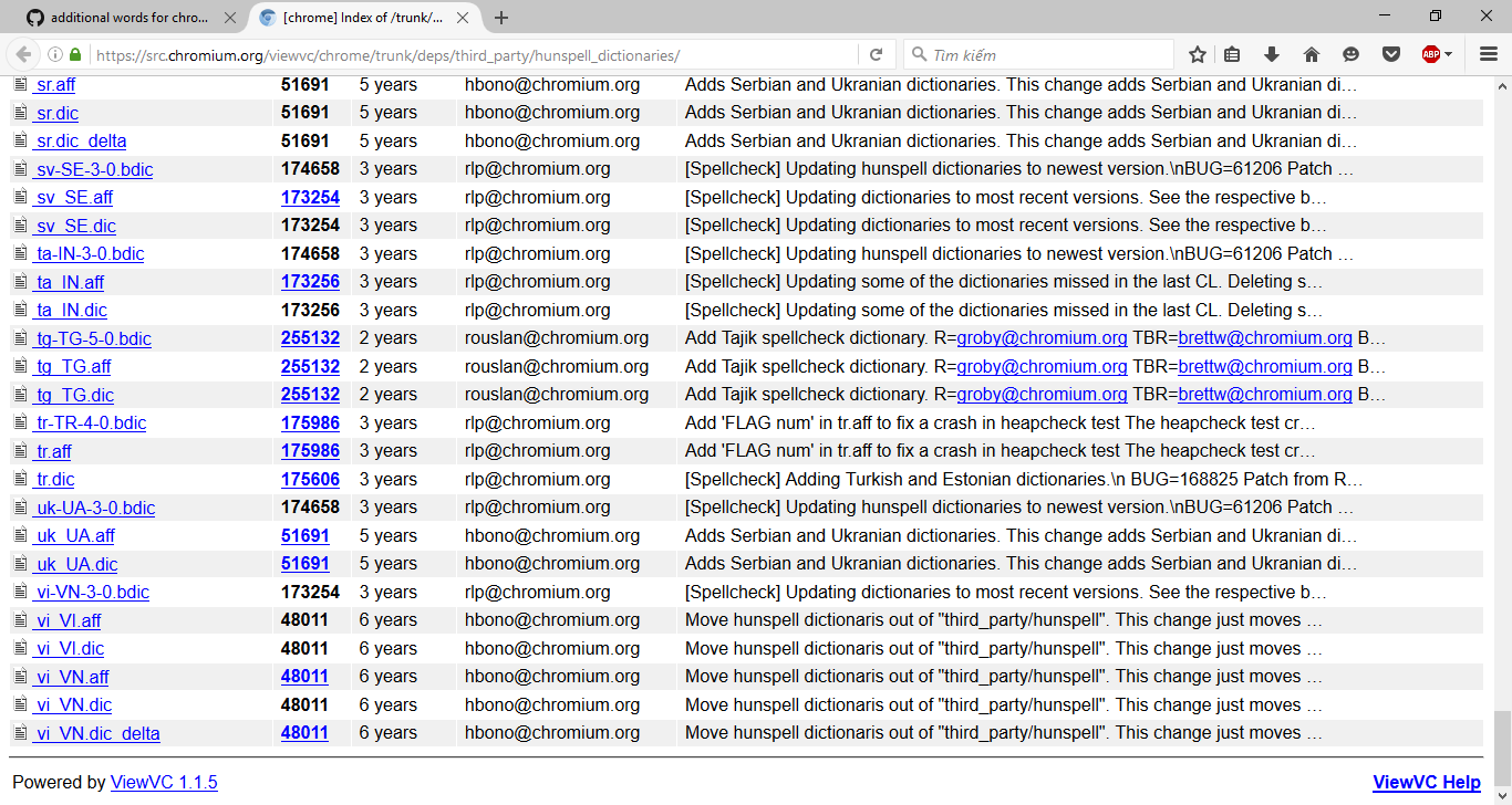 Vấn đề mình đẩy file này do có lỗi và mình đã bổ sung lại các từ còn thiếu, trong đó bao gồm bỏ dấu kiểu cũ và bỏ dấu kiểu mới trong cùng một file (do chrome không hỗ trợ hai file từ điển riêng cho từng ngôn ngữ như firefox). Nguồn file này từ trang chromium.org đã lâu không được cập nhật và còn thiếu rất nhiều từ như à, nà, ngà, và, là, quà,...