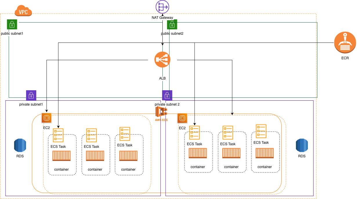 Private Subnet์์๋ ECS ํด๋ฌ์คํฐ๋ฅผ ๋๊ณ ๊ฐ์ฉ์ฑ ๋๊ฒํ๊ธฐ ์ํด ๊ฐ๊ฐ์ ๊ฐ์ฉ์์ญ์ EC2๋ฅผ 1๊ฐ์ฉ ๋ฐฐ์นํฉ๋๋ค EC2์์๋ ์คํ๋ง ๋ถํธ ์ปจํ ์ด๋, Redis ์ปจํ ์ด๋, Nginx ์ปจํ ์ด๋๋ฅผ ๊ฐ๊ฐ ํ์คํฌ ์ ์๋ฅผ ํตํด ๋ฐฐ์นํ๊ณ ํ๋ผ์ด๋น ์๋ธ๋ท ๊ทธ๋ฃน์ RDS๋ฅผ ๋ฐฐ์นํด์ค๋๋ค. ๊ทธ๋ฆฌ๊ณ CI/CD ๋ฐ ์ด๋ฏธ์ง ์ ์ฅ์๋ฅผ ์ํ ECR์ VPC ์ธ๋ถ์ ๋ฐฐ์นํด์ค๋๋ค