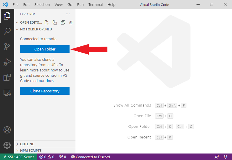 benjaminwheeler@my-server.com:~$Secondly, the bottom left corner of VSCode should read: SSH: <server hostname>, indicating it is connected to a remote host.