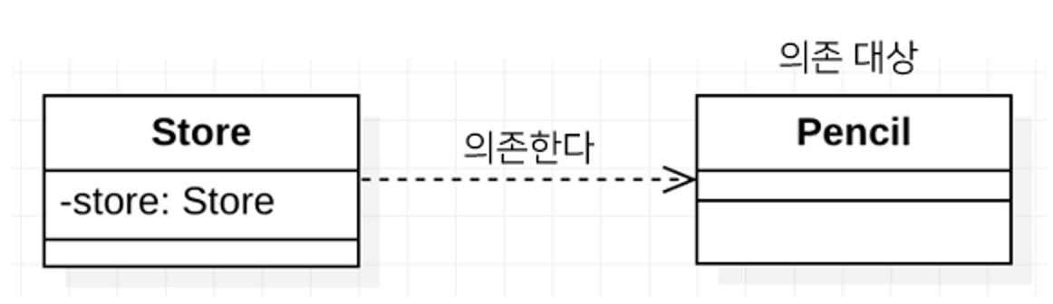 의존성이란 한 객체가 다른 객체를 사용할 때 의존성이 있다고 한다. 예를 들어 다음과 같이 Store 객체가 Pencil 객체를 사용하고 있는 경우에 우리는 Store 객체가 Pencil 객체에 의존성이 있다고 표현한다.