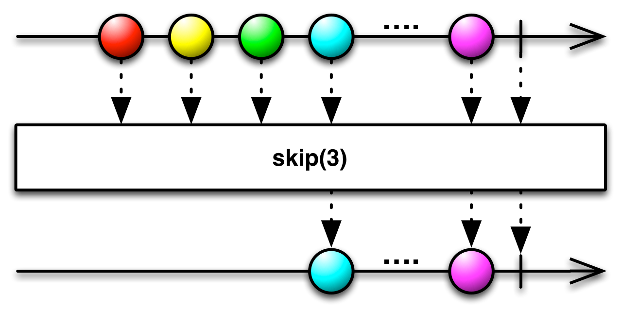 You can ignore the first n items emitted by an Observable and attend only to those items that come after, by modifying the Observable with the skip(n) method.
