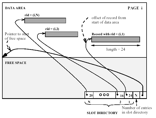 A note on the slot directory: In the description in the text, the slot directory is located at the end of the page, and grows toward the beginning. This has confused students in the past, since it means that negative offsets into the slot directory have to be used, so the current definition of HFPage has the slot directory at the beginning of the page, after a few fixed member fields, and growing toward the end. This does mean, however, that you will need to write the code so the records themselves are placed beginning at the end of the page. Be very careful with your pointer arithmetic.