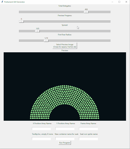 The diagram creator tool requires Python 3 and the Pillow library (pip install Pillow). The tool is a GUI built in tkinter and is fairly self-explanatory, simply move your sliders to design a nice looking diagram, select an icon, fill in the fields below the preview, and click "Generate Output." Resulting code is all included in the parliament_gui_code.txt file, comments explain where to put each part.