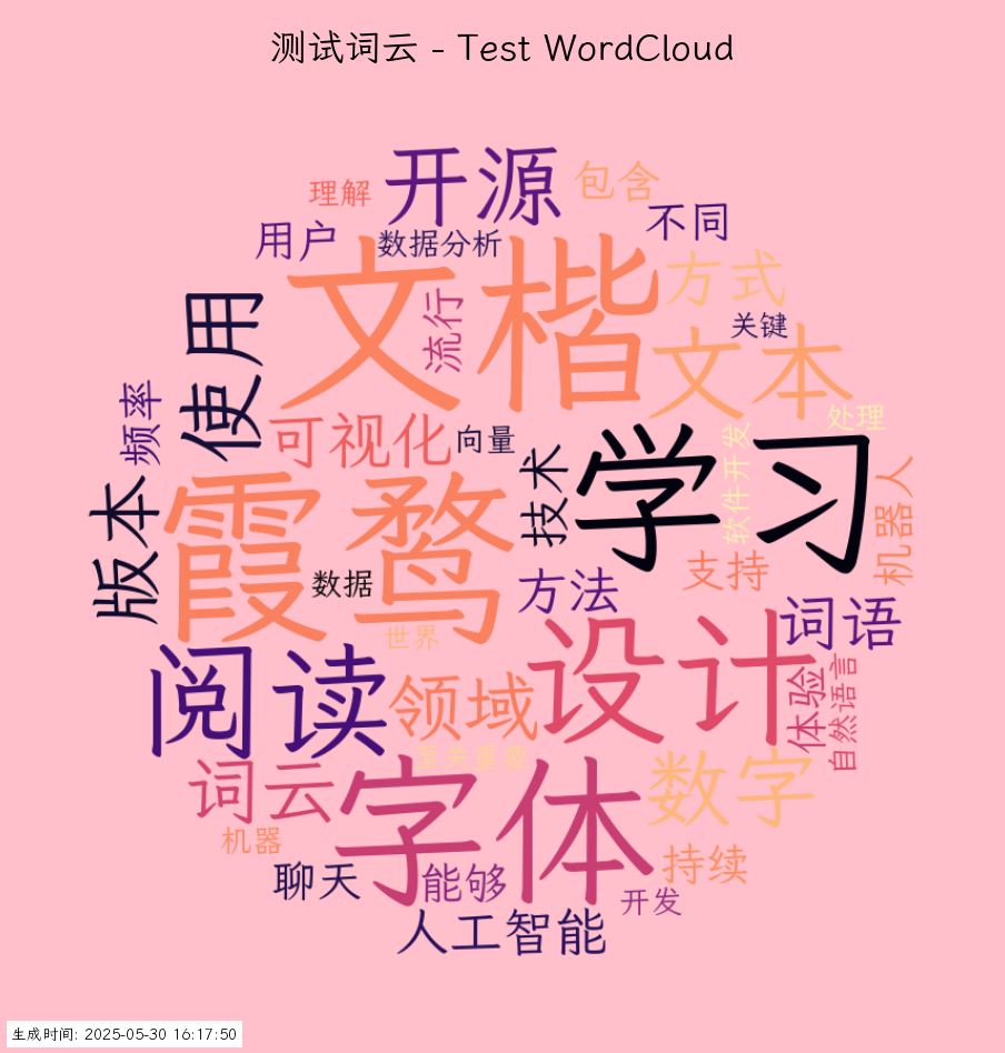 min_font_size: 控制低频词汇的最小字体大小(默认值:8)max_font_size: 控制高频词汇的最大字体大小(默认值:170)- 这些配置项允许用户根据需要调整词云的视觉对比度