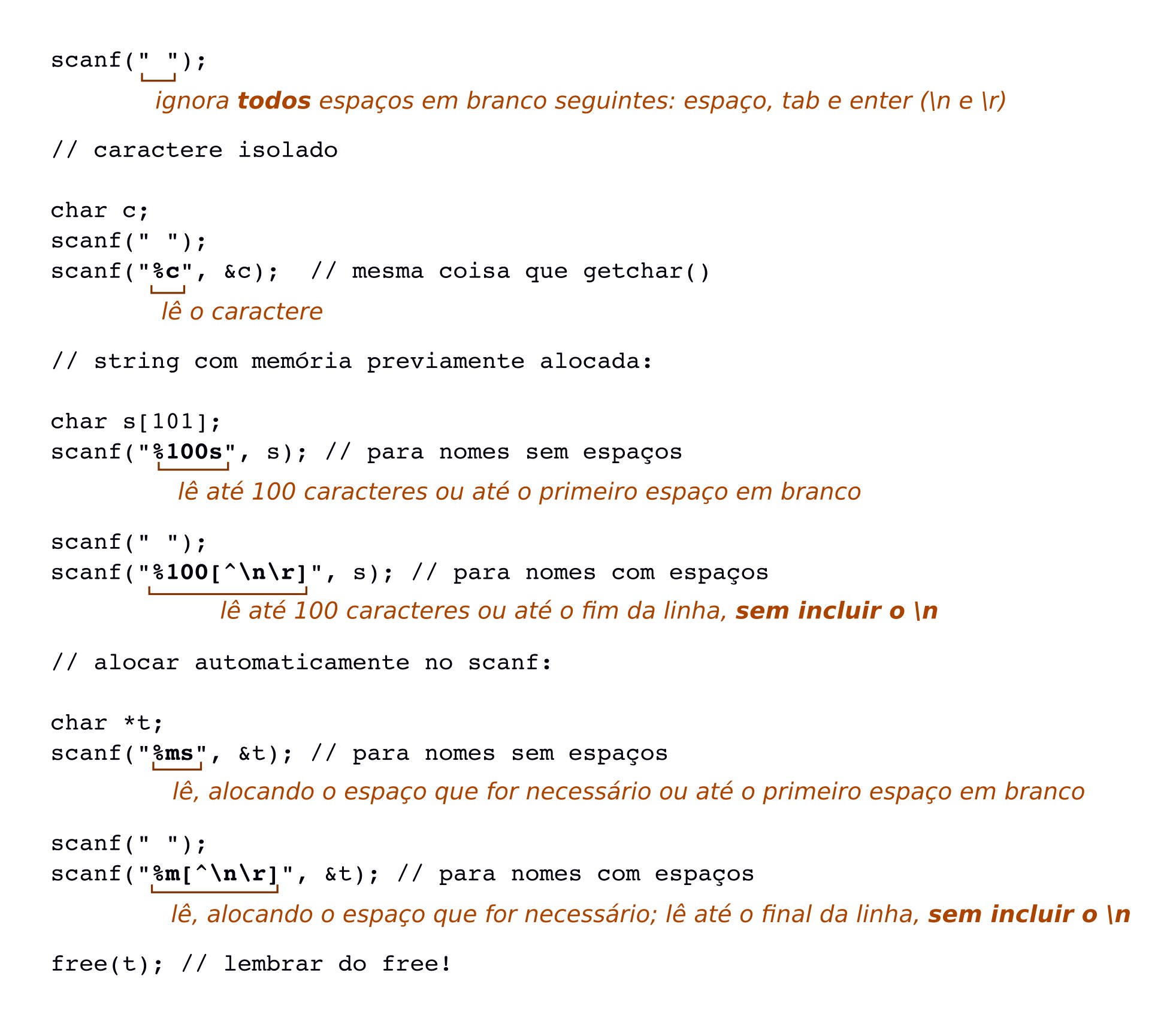 Outra coisa interessante para se notar é que o especificador %s lê caracteres até que seja encontrado algum espaço em branco, como ' ', '\n' e afins - e esses caracteres continuam no buffer após a leitura.