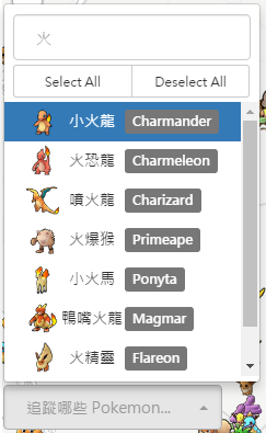 你可以在搜尋框中查找你要找的寶可夢(支援中英,安心服用),如下圖,搜尋 「火」 字: