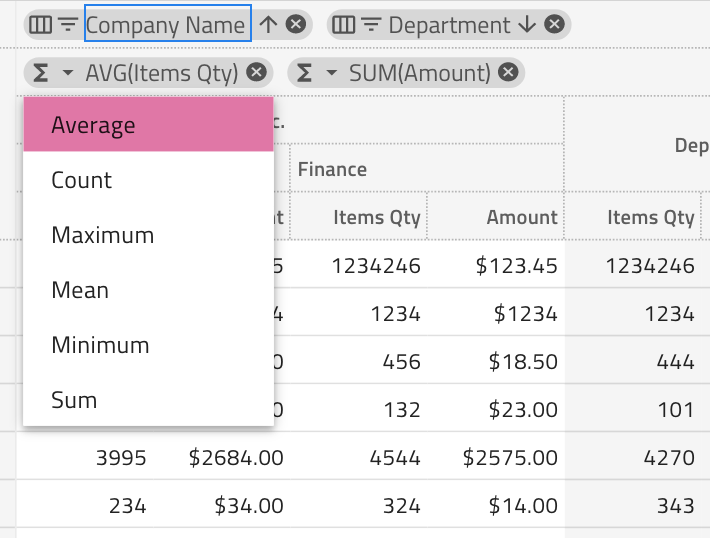 filtersas well that can allow filtering unique values for the related row/column fields in an excel style like fashion. - Should allow sorting the data represented in both