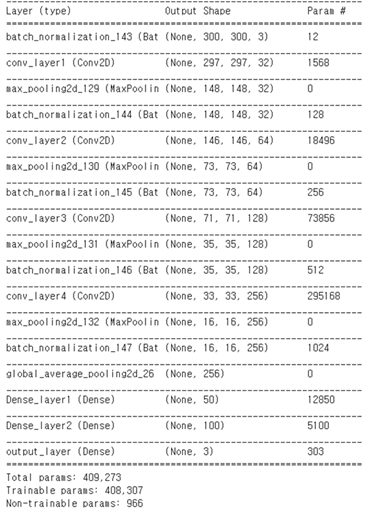 - keras.preprocessing.image의 ImageDataGenerator를 사용하여 이미지의 각 픽셀 값을 0~1로 변환 - 위와 같은 외부 정규화 방법을 사용하였을 때, 가장 좋은 성능을 보였던 모델의 성능 평가 - - - - Exploding gradient 문제를 해결하기 위해 tensorflow.keras.layer의 Batch Normalization 사용 - Batch Normalization : 각 레이어에 들어가는 input을 정규화하여 학습을 가속하며, Vanishing / Exploding gradient 문제를 해결하기 위한 방법 - 위와 같은 레이어 구조에서 Batch Normalizastion을 사용한 모델의 성능 평가 - - -