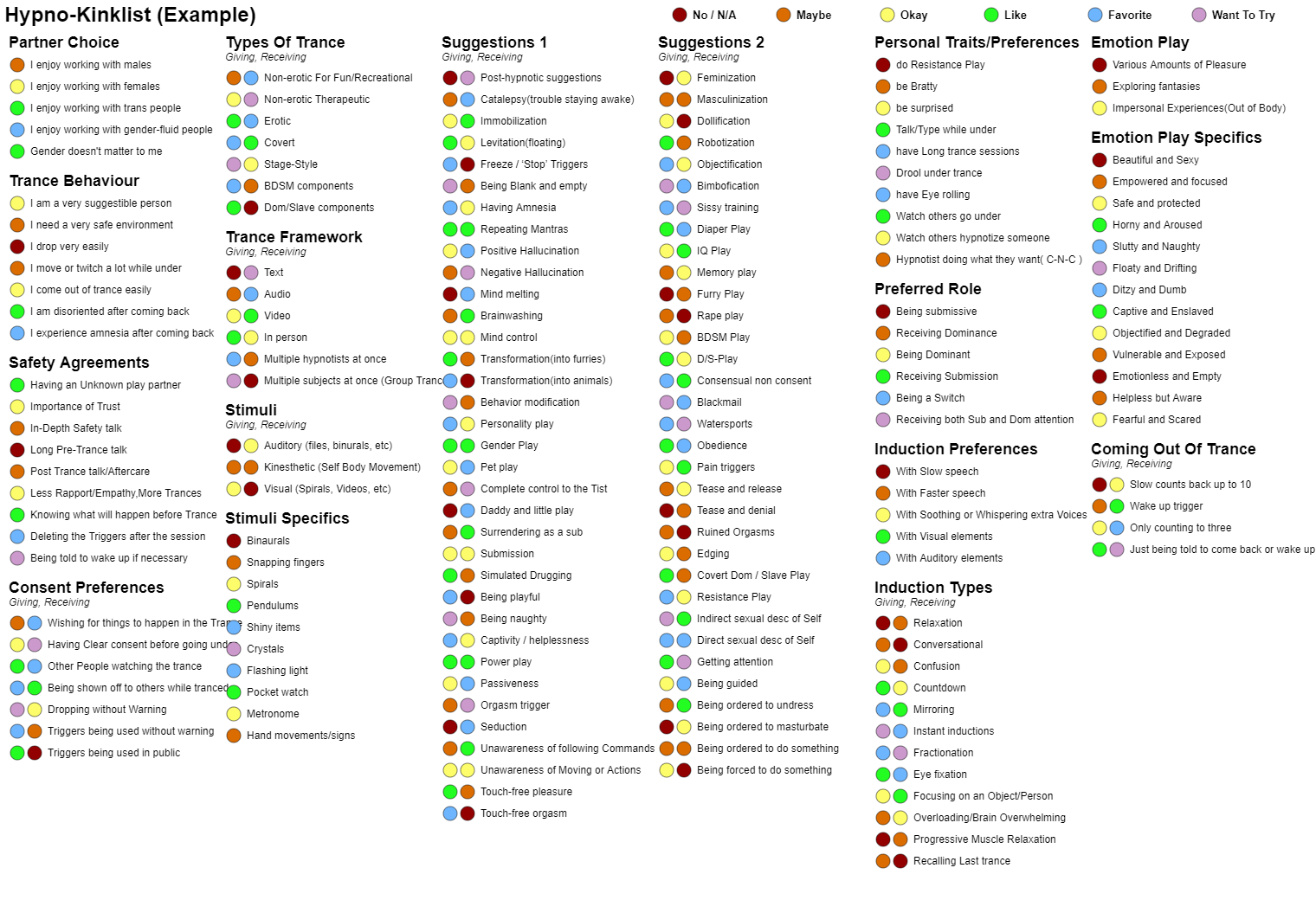 KinkList Easily create kink list Make yours here Example Also, each time you make a change to your kinklist, the URL updates. Giving you a unique URL to share your kinklist with others.