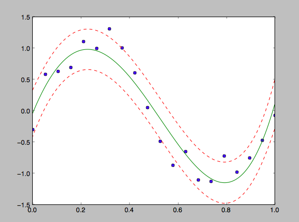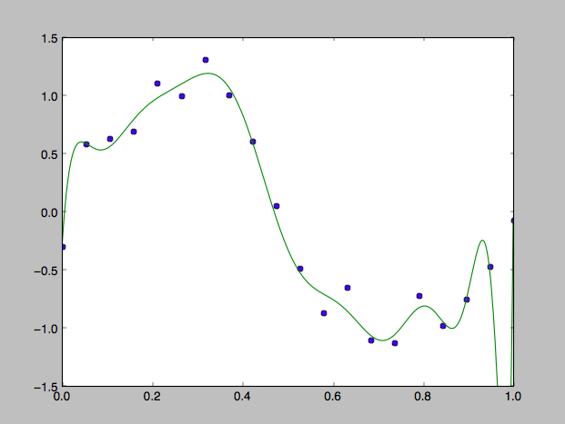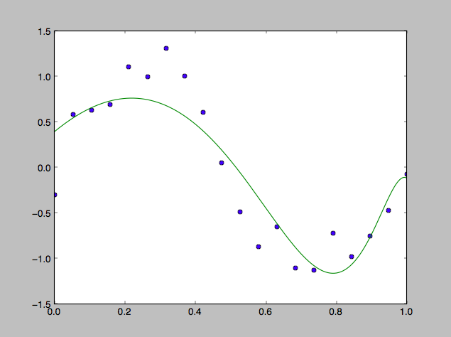 ロジスティクス回帰のアルゴリズムを実装してみた 推定対象の関数はsin関数を選んだ。0.0から1.0の範囲内で平均値0.0, 分散が0.2に従うガウスノイズを加えたものを10点用意。 それを訓練データとした。モデルは20次の多項式関数を使用。