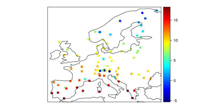 spatialPlot(climatology(example3), backdrop.theme = "countries", colorkey = T)The GSN dataset contains data for a World station network. A subset containing the stations with at least the 75% of the data in the period 1979-2012 (374 stations) can be downloaded as follows: