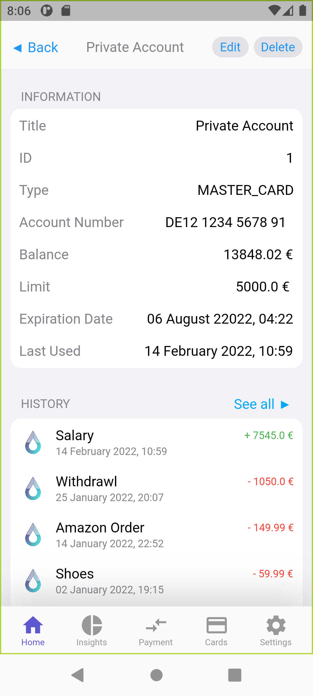 - delete account screen (returns to accounts screen, after deletion)