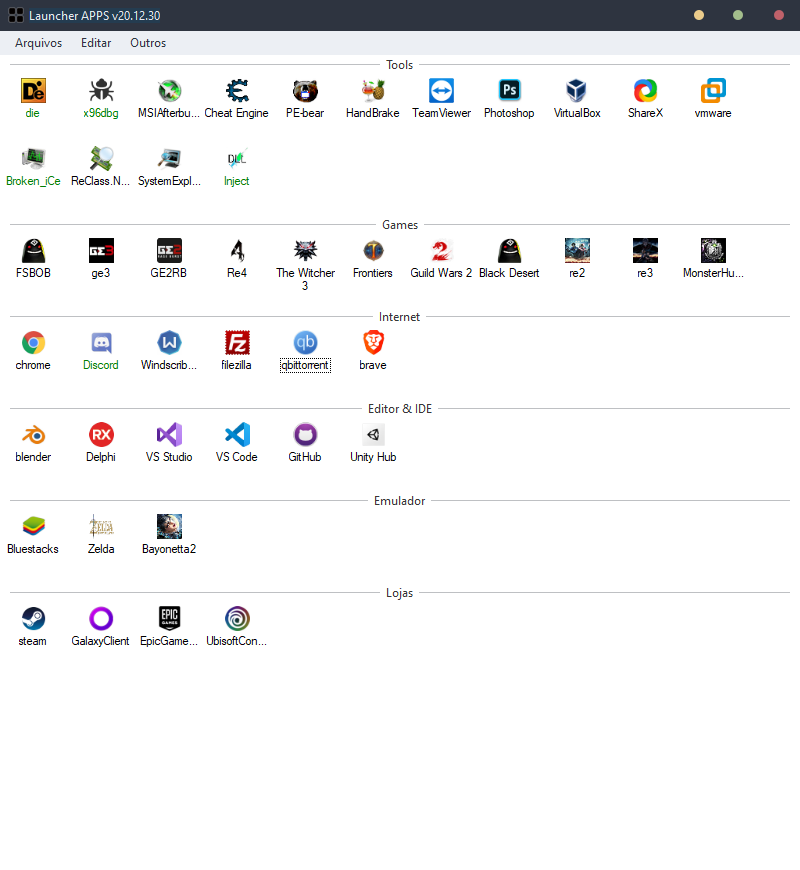 Nele é possível criar grupos para distinguir vários tipos de atalhos, como GAMES, OFFICE, DECODES, ETC.