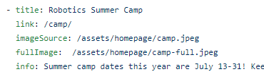 The "list" format allows us to easily add, remove, or edit cards and the order of the homepage cards. For example, this is the summer camp card: