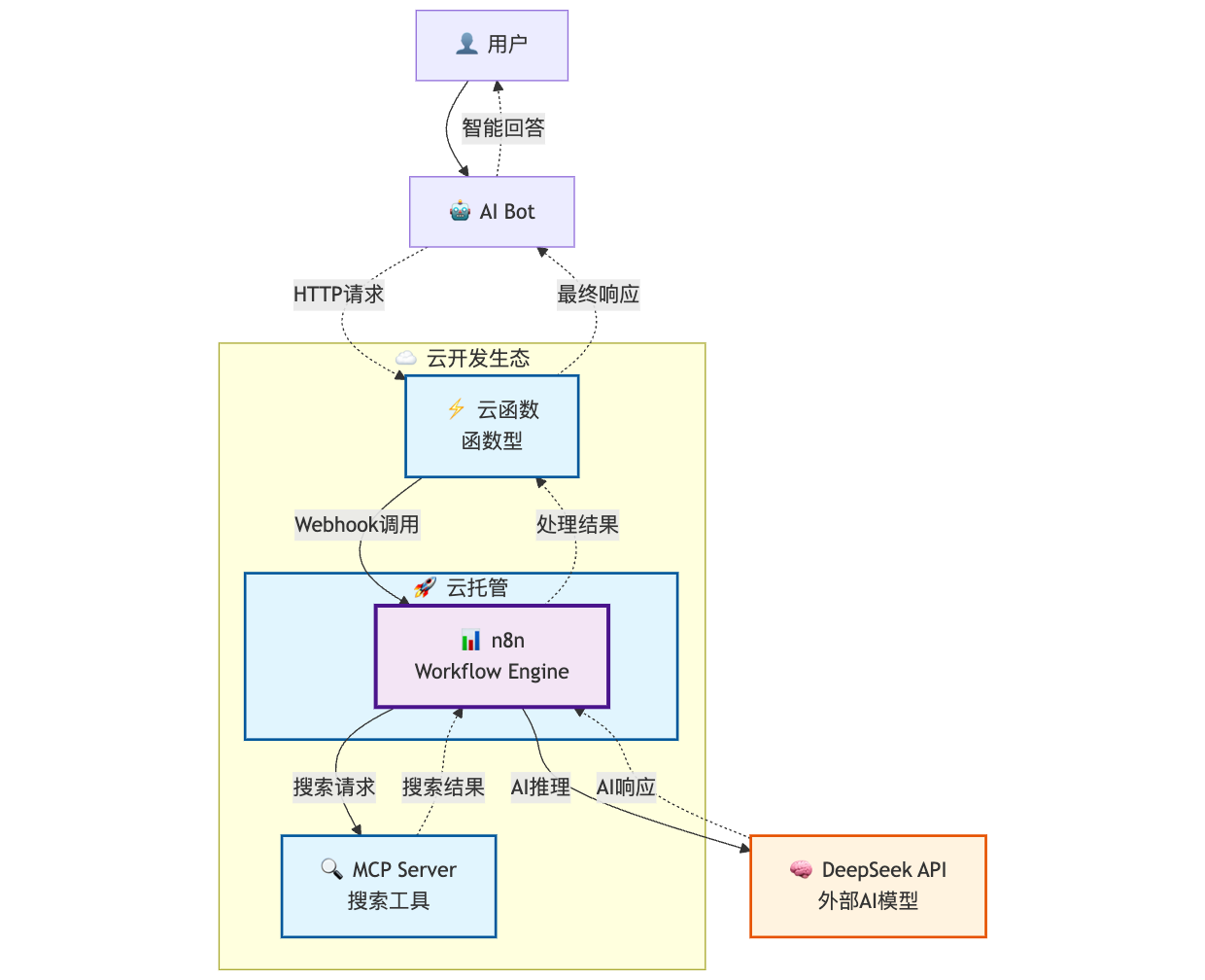 这个方案的强大之处,在于云托管与 n8n 的完美结合,以及对云开发生态的无缝利用。让我们通过一张架构图来理解它的工作原理: