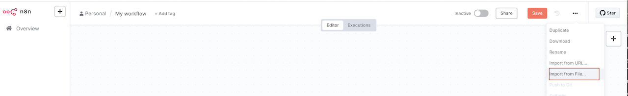 Import from File,将该文件导入,即可看到我们预设好的工作流。 -