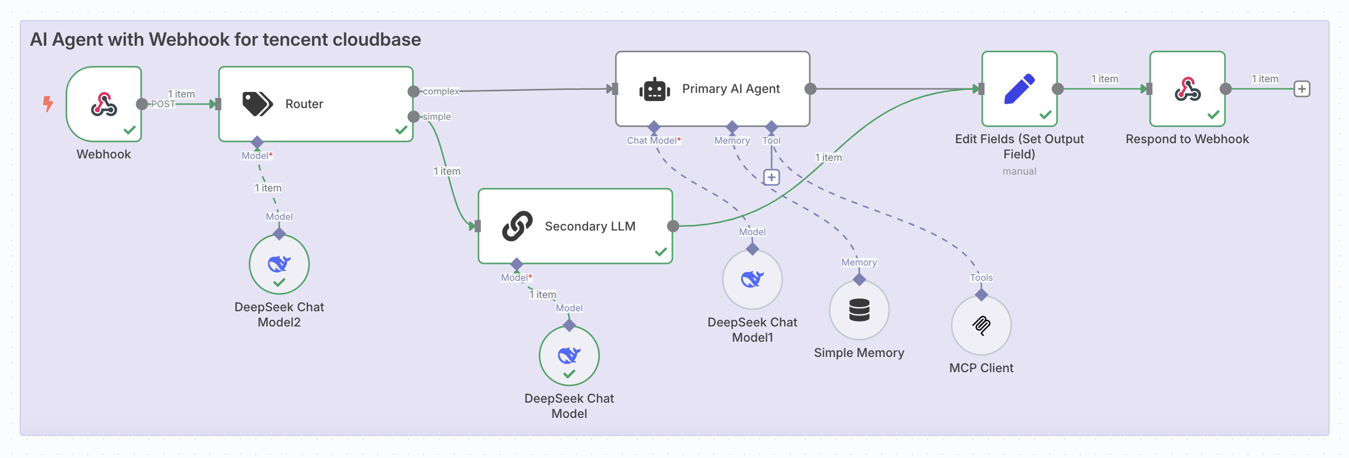 在开始动手之前,先来看看我们最终要实现的成果。我们将构建一个智能路由 Agent,它能像一个聪明的调度员,接收用户的日常提问,如果是简单问题,直接使用一个轻量级的 LLM 快速回答节约成本减少等待时间,如果比较复杂,可以使用一个更强大的 LLM 并且调用云开发搜索工具来获取相关资料,从而提供更准确、更专业的回答。 这个智能助理的核心,就是下面这个在 n8n 中设计的 Workflow: