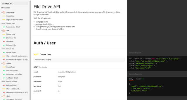 It is a Python/Django API allowing you to manage your own file drive in the cloud. You can see it as a Google Drive API clone. Here is a list of the main features of the API: