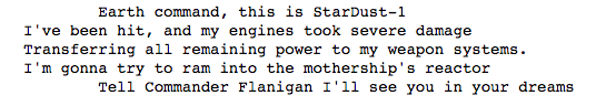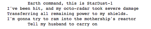 I played around with the generators we were given, and I really wanted to make my own simple one. The generator is very simple. I made a template of the message and then made 6 lists of the different components. The different words are being chosen randomly, and give new details on the scene or the hero's actions. Then I used "print()" and constructed the poem. I decided to give the poem a shape that reminded me of a spaceship from the side.