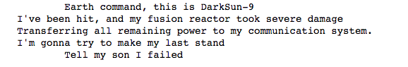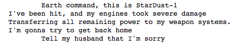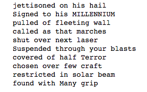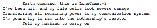 I call it "Last transmission". I have a wild imagination, this time it involved Sci-Fi scenary. The Idea behind this poem generator is to recreate the last communication sequences from a combat ship in distress. I chose this subject, or this kind of text because it seems like it's very far from poetry. With calling this a poem, I make the readers see these transmissions in a poetic light. The concept came to me really fast and really intuitively, so it's a bit hard for me to write what I was thinking. Anyway...
