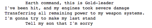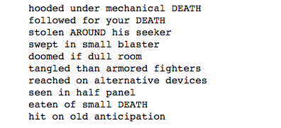 The combination of space-battles, stupid dialogues, scenary descriptions, 70's jargon, and a whole lot of "DEATH" - creates a funny twisted poems and some crazy lines.