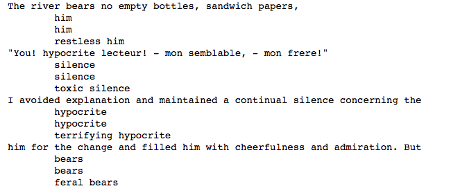 For the n-gram poem, I looked at what are the most common pairs of words, and then I had randomly selected out of the first 50. Using those "pairs" I made two generated markov-chained and seperated them with a line. Well, It's not really a poem but I enjoy the subtle-but-not-subtle mess it does to the story.