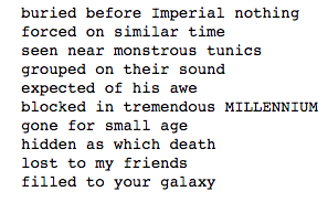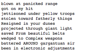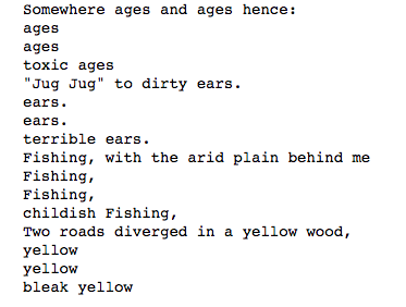 I believe, that the procedural technique and the choice of source are the paint brush and the colors we are given as readers. For example - the resolution and the relations between the words in the text can determine the nature and the abstraction of the poem. The farther the connections are, the more mystery we get. The splising mechanism paves the layout of the poem. It creates a path for us to walk through. To walk in the general places that the poet wanted us to walk.