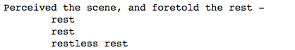 the main frame of manipulating a text file is to turn it into a list. In my example I started by creating a list of lines and then I drilled a little more and used single words. I took two poems, and chose two random lines from each one. Then I chose a random word from each line and repeated that word for three times. On the third time I added another phrase or adjective that gives an extra twist for the repeated word. During the work, I played aruond a little with the order of the lines and mashed the chosen words a bit more. In the end I chose a chiastic frame. I repeated a word from the last line, after the first line. Then repeated a word from the third line, after the second line, and so on. I just love chiastic structure.