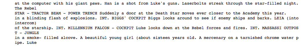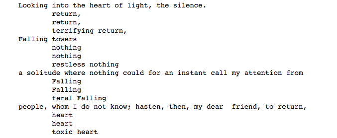 When I read the first example in "Start with poetry" and the comparison between the two pieces, I had a thought about an element we talked about in another class("Nothing-creating illusions"). In "Nothing" we talked about vision and how our brains are working to complete an outline of an object. We saw some examples of fragments of an image or an object, and we were able to materialize and figure what exactly are we looking at. The important idea of subtracting as much as possible without loosing the meaning realy spoke to me. I tend to think, that the less you present, the more interactive your piece can be. "Shaving" the transitions and the perfectly-makes-sense elements, gives the reader more space to be immersed in the search for meaning. I didn't notice this method (or rather couldn't point it out) so far, and now that I do, I realize how powerful it is.