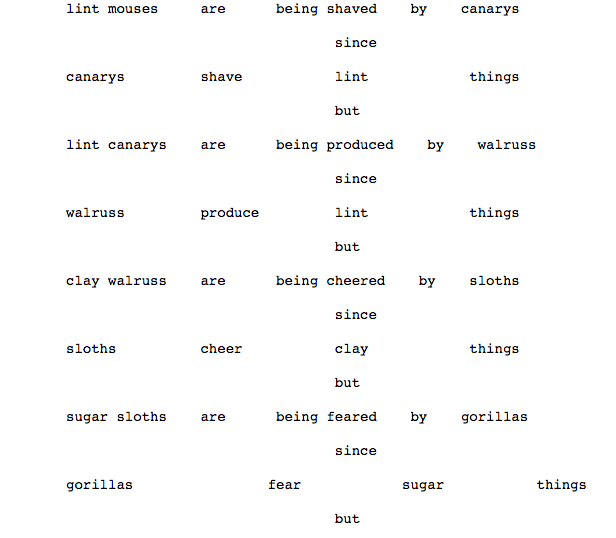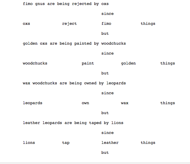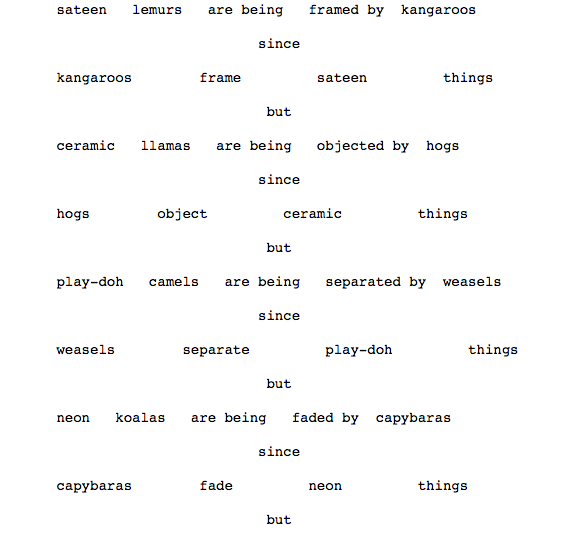 I used a few JSON files from "corpora", and got a little lost inside the 'verb' file. Since I wanted to use pefect tense, i needed the big file which is pretty messy and contains a lot of junk. I used 'tracery' to create the poem 'links' but then I got stuck in reusing the same animal and material twice, I turned to Kate Compton through Google and got over the obsticle (see assignment notebook). I wanted each 'link' or poem in the 'for loop' to use different verbs but inside the poem I needed to use the same verb twice- for that (and with the help of Allison) we duplicated the rules-dictionary and took the verbs outside to the for-loop. The specific layout of each poem was decided in orde to look like a chain that is being linked with transitions and circular "buts". What I haven't managed to do with "Tracery" is to make the "active" animals become th "passive" animals in the next poem or "link in the chain". I have made another notbook that does not use "Tracery" and managed to make tha chain effect I was looking for.