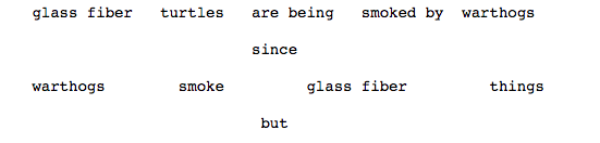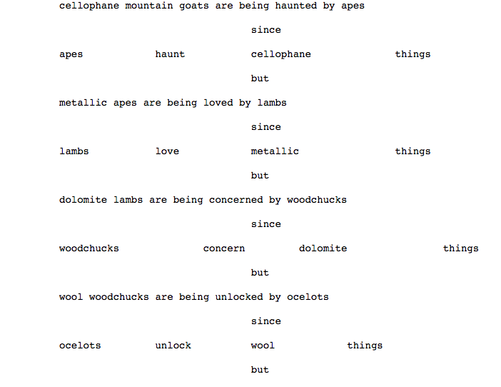 I used SpaCy to choose the verbs and the nouns (The important parts of speach) from the randomly-picked sentence. for each verb/noun I randomly picked a rhyming word using "Pronouncing" and parsed them all back to the sentence. So, the first sentence of each iteration is from Al's presentation and then comes the broken sentence.