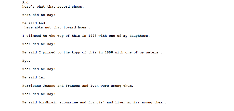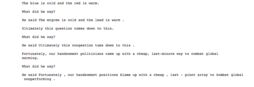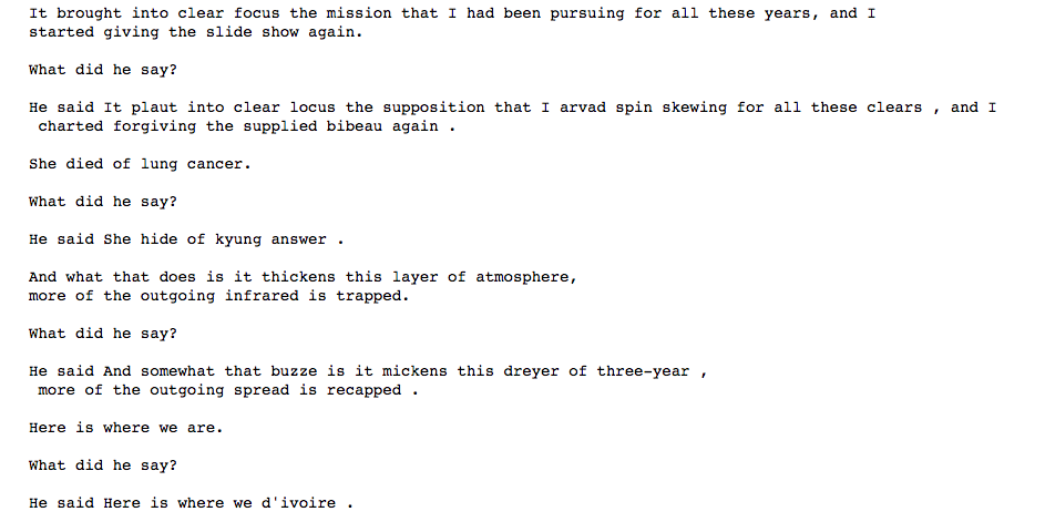 As part of my research for a different project I looked into the trancription of "Inconvenient Truth" - the famous environmental presentation of Al Gore. I imagined two senior citizens sitting in the audience (kind of like Statler and Waldorf from the Muppet Show), and constantly confusing each other by mishearing what the former senator says.