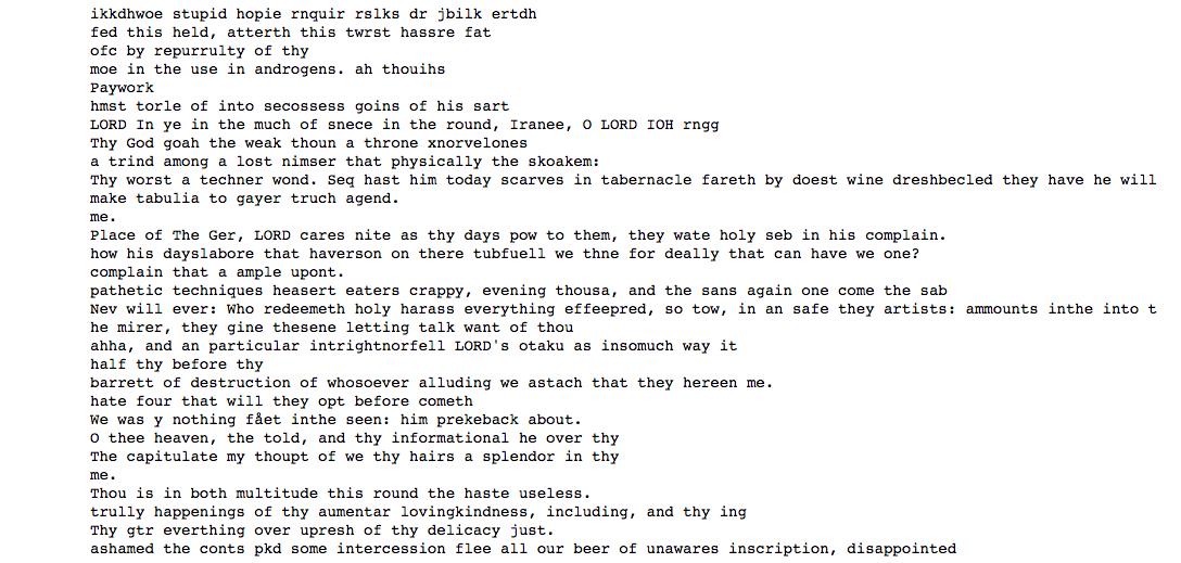 Then I took this corpus and trained the "textgenrnn" training model to create my own gibberish model. Now - in order to make the output interesting I decided to use another source text that I'll infuse into the gibberish model, thous turning it to a somewhat readable text. For this matter I was thinking, which piece can be Ironically merge into a giant pile of nonsense. I came up with King David's Psalms. As one of the oldest writen poetry, the Psalms has a distinct style, and an iteresting vocabulary.