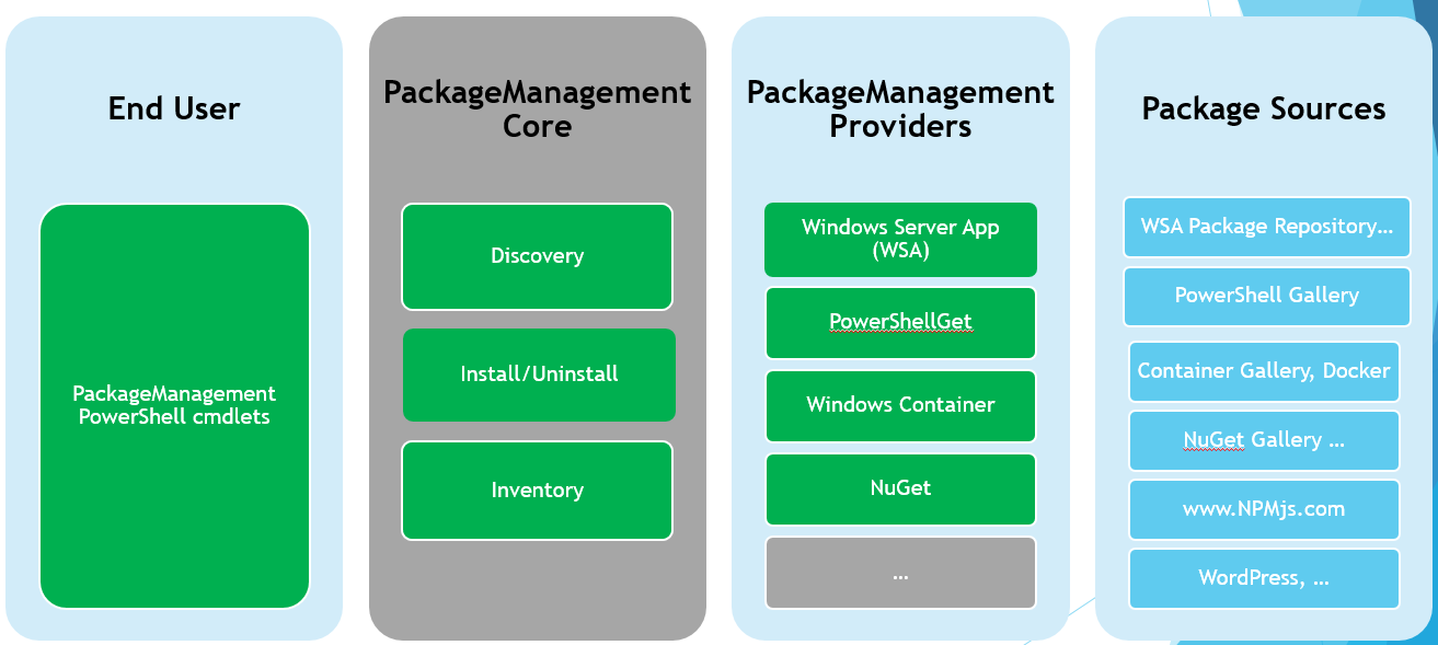 OneGet is a Windows package manager, renamed as PackageManagement. It is a unified interface to package management systems and aims to make Software Discovery, Installation, and Inventory (SDII) work via a common set of cmdlets (and eventually a set of APIs). Regardless of the installation technology underneath, users can use these common cmdlets to install/uninstall packages, add/remove/query package repositories, and query a system for the software installed.