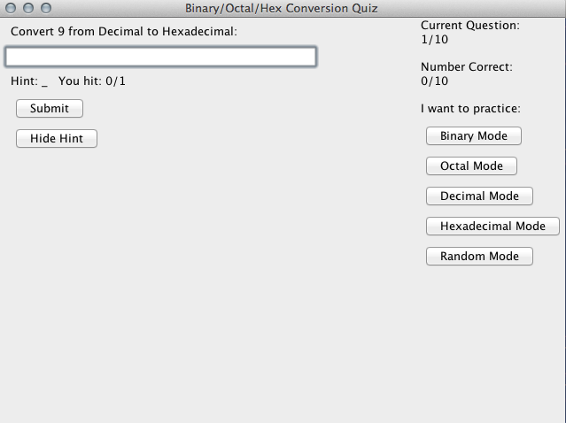 A GUI for a quiz program that allows you to practice number conversions between decimal, binary, octal, and hexadecimal. There are several 'modes' available - random mode (the default) will practice conversions from any radix to any radix, while the other modes are for practicing conversions to a specific radix, such as binary.
