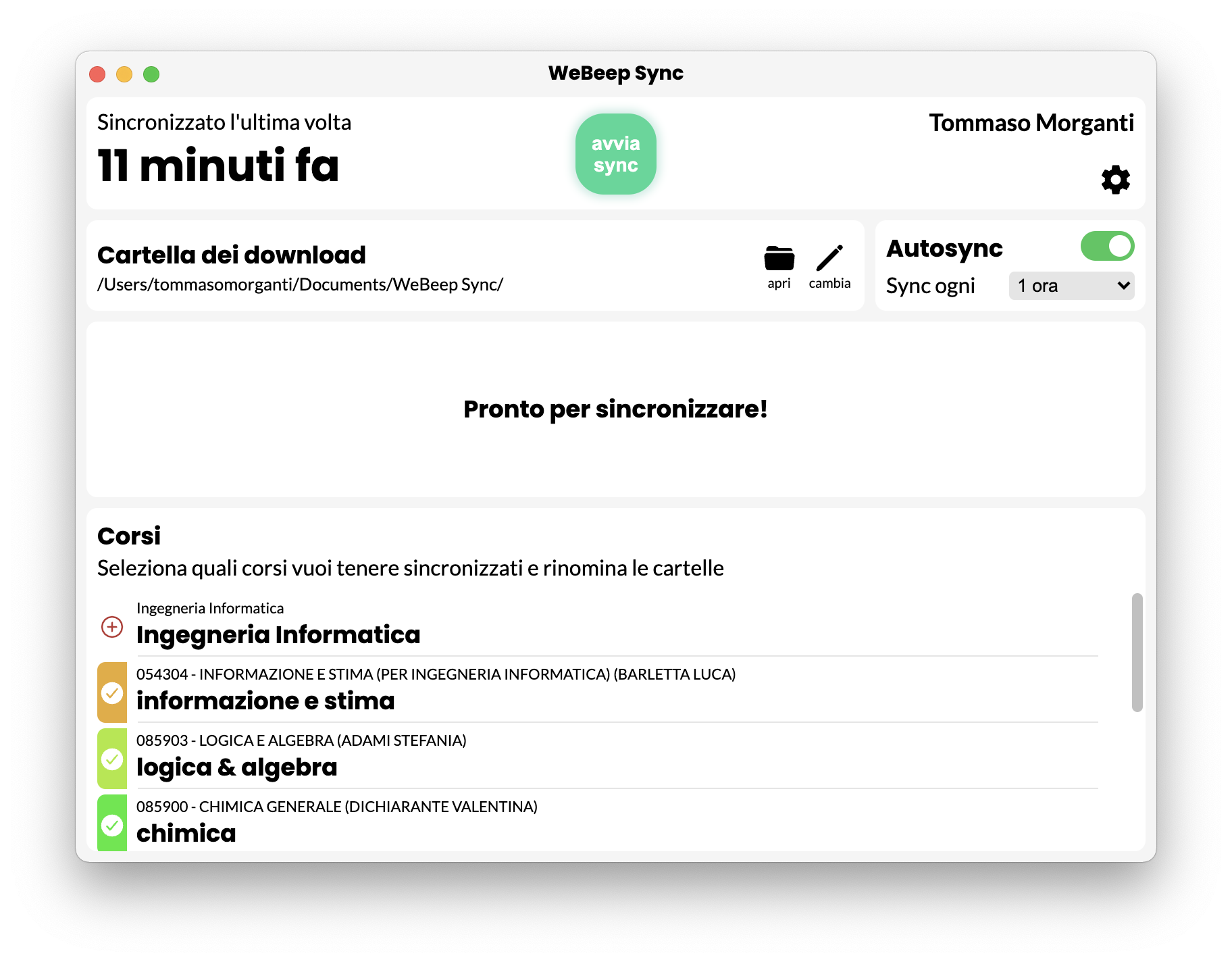 - puoi selezionare quali dei tuoi corsi sincronizzare