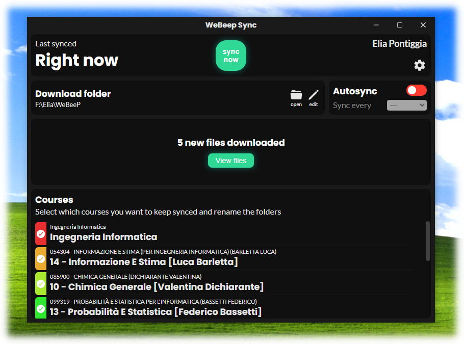 Proprio come PoliBeepSync, serve per tenere sincronizzati i propri file di WeBeep in una cartella locale sul proprio PC. Se vuoi un'esperienza senza pensieri, puoi lasciare che l'app si apra in background e puoi scegliere ogni quanto avverranno le sincronizzazioni, così da avere sempre tutti i file aggiornati. Oppure puoi disattivare l'autosync e scaricare tutti i file in una volta sola quando preferisci.