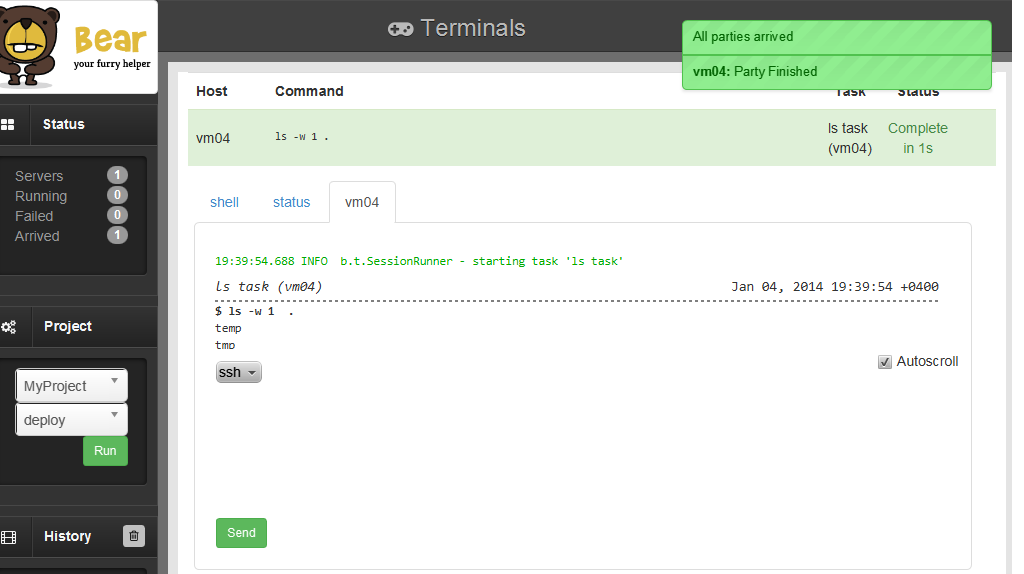 To quickly start using Bear, check out the Quick Start Guide. There also might be an interesting topic to read in our Wiki. There are demos and examples to use as prototypes for your own projects. These demos are also used as integration tests. At the moment Bear supports Node.js, Grails, Play! Framework.