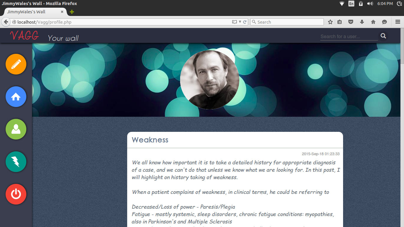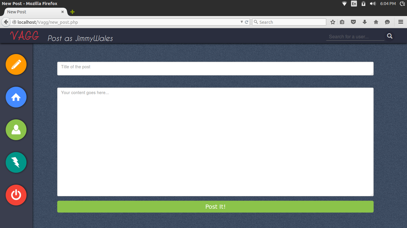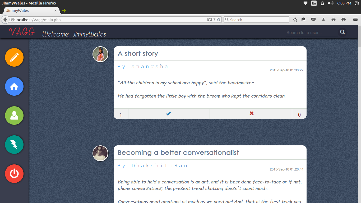 Project-Vagg This website enables you to publish articles/blogs/posts. People can follow or unfollow you. The posts of all the people you follow appears on your wall. You can like or dislike a post. Top posts are displayed on the trending section. Screenshots Index Home New Post Profile