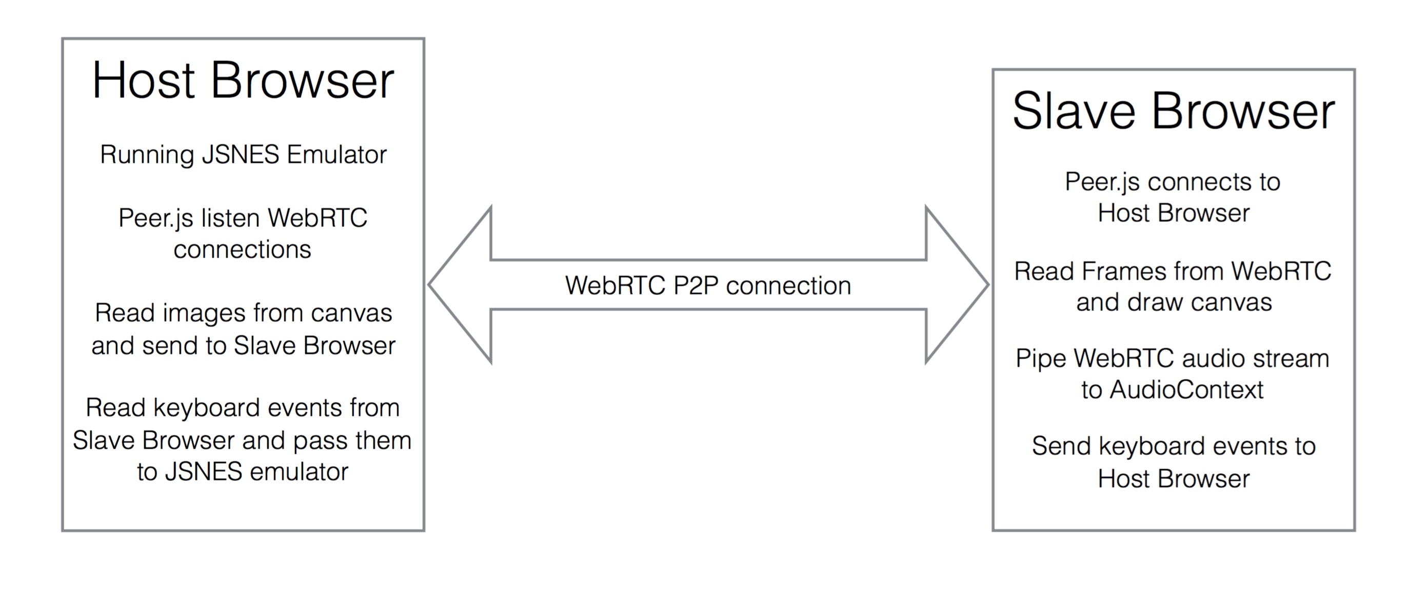 Since HTML5 canvas cannot act as a MediaSource we need to extract each frame separately for sending NES screen to slave. Host runs JSNES emulator and reads images from canvas rendered by JSNES, sends them thorugh WebRTC connection to slave machine which then renders them in to remote HTML5 canvas. Images are sent as base64 encoded png or jpeg strings.