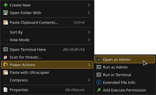 cd /home/USER/scripts/PowerActions/ chmod +x openasadmin.sh runasadmin.sh runinconsole.sh xfileinfo.sh xpermission.sh cd /home/USER/.local/share/kservices5/ServiceMenus/ chmod 644 poweractions.desktop