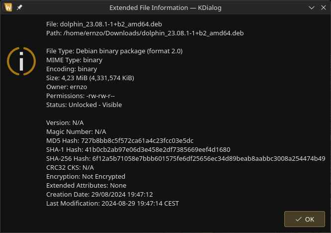 - Version, Magic Number, MD5 Hash, SHA-1 Hash, SHA-256 Hash, CRC32 Checksum, Encryption, Extended Attributes, Creation Date, Last Modification Date