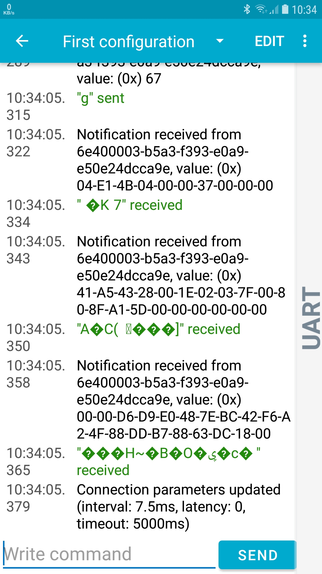 Using nRF Connect to read data from my Bluetooth sensor, I write 'g' to the RX characteristic and then read 1099 packets of data via notifications (23 Byte MTU size, including 3 bytes header). See screenshot: