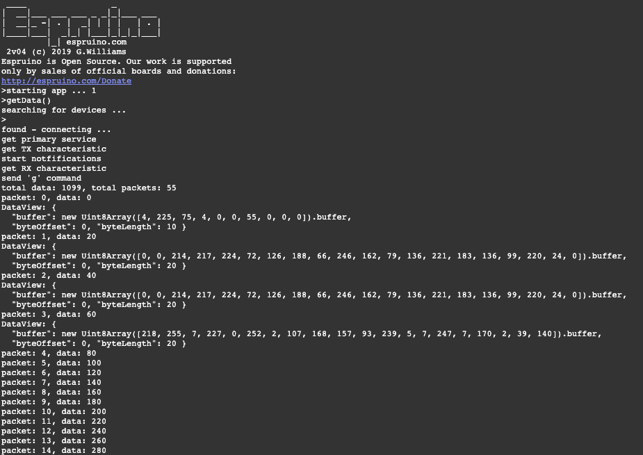 Posted at 2019-10-12 by AkosLukacs Ah, ok, that explains why I couldn't count 23 bytes on the screenshot :) My guess was the too large MTU somehow confused the Espruino. But one more "maybe": remove the console.log statements from the receiving, and print the first 4 packets after receiving is done. Sending that 20 byte DataView in that "nice" format takes several 7.5ms connection intervals. Maybe that interferes. But it's just a guess... |