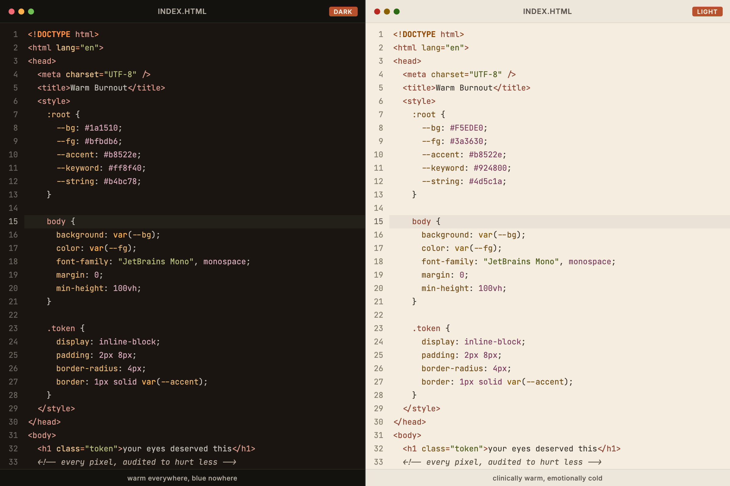 Built on one premise: your eyes are taking damage and your current theme doesn't care. Warm Burnout does. Fully warm palette, minimal blue light, contrast-audited to clinical standards. Two variants: Dark for the 3am sessions and Light for when someone forces you to open the blinds.
