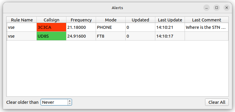 shown in the Alert Window; Callsign order is given by this approach. If the Callsign does not exist in the list then it is added to the first position. If it already exists, only the "Updated" count is updated (its position is not changed). The sorting in the window can be chosen by the user. Double-clicking will tune the DX frequency as requested. The specific tune process depends on the information source. When using a DX Cluster as the source, only the frequency and Callsign are used. When using WSJTX, tune is made within the WSJTX application.