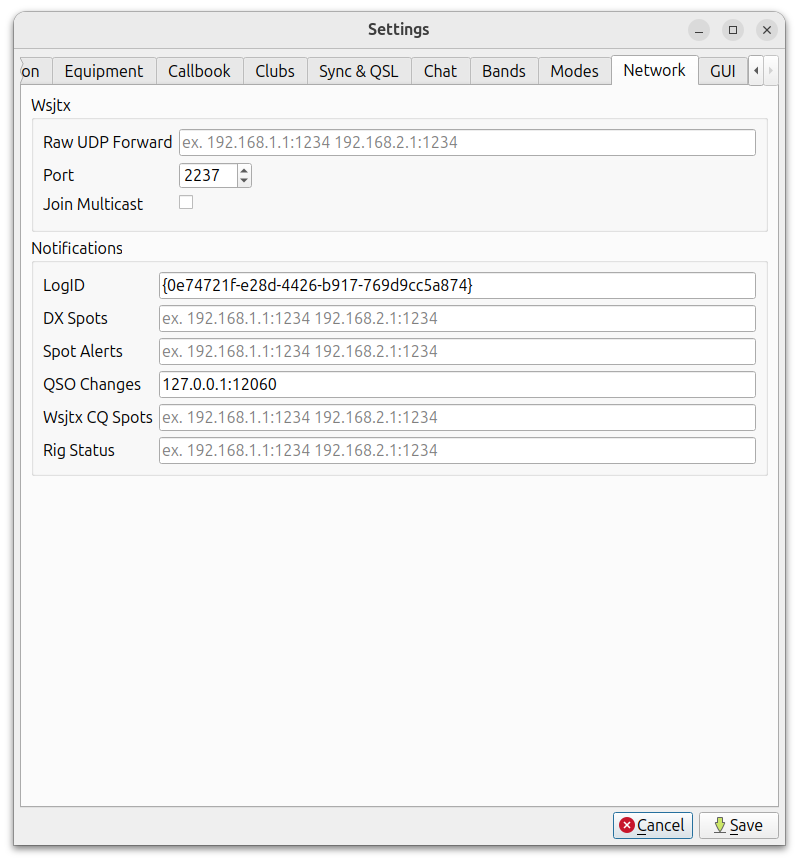 127.0.0.1:12060toFile→Settings→Network→QSO Changesas below.