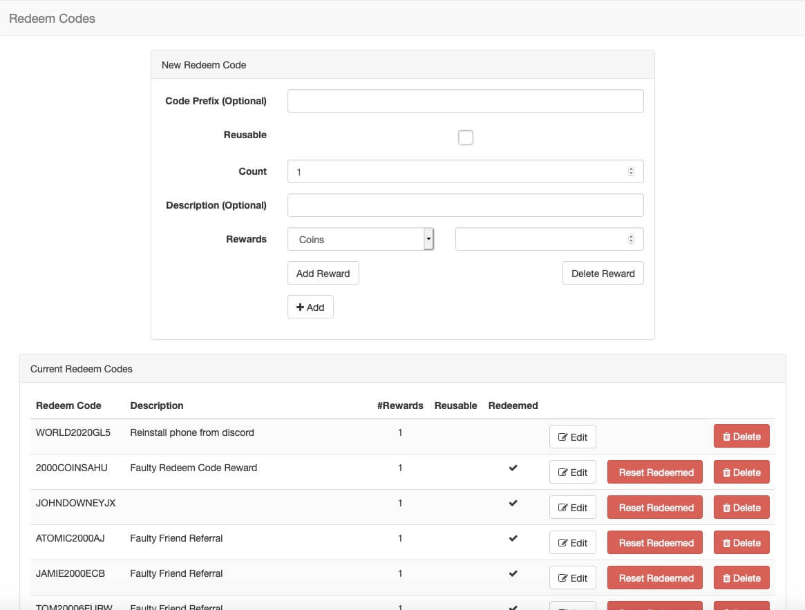 Use this interface to browse, create, and manage redeem codes visually.