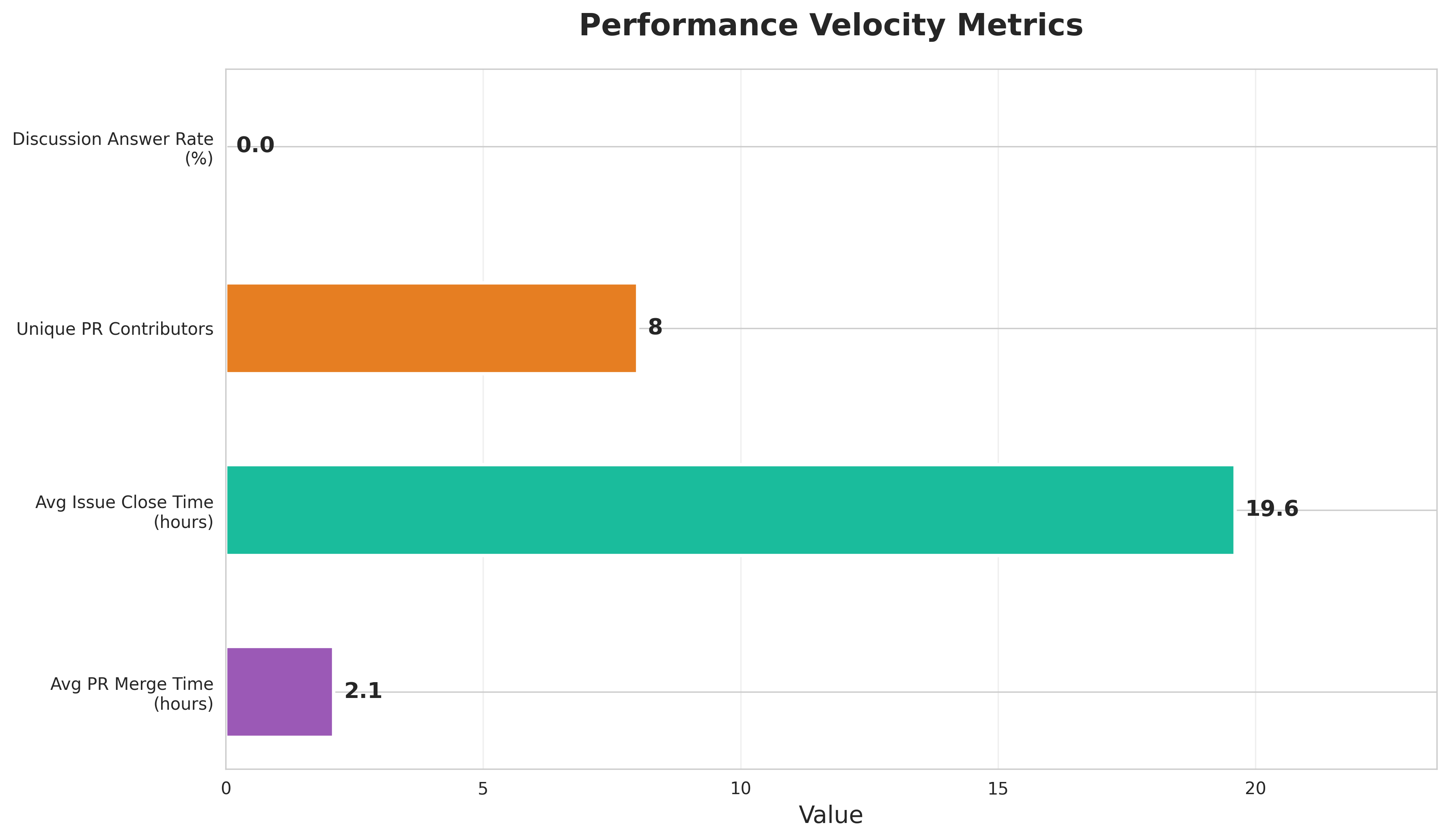A 2.1-hour average PR merge time is exceptional and suggests a culture of fast, focused code review. The 19.6-hour issue resolution time is reasonable for an active project. With 8 unique contributors, the project has a healthy contributor base without being overly concentrated.