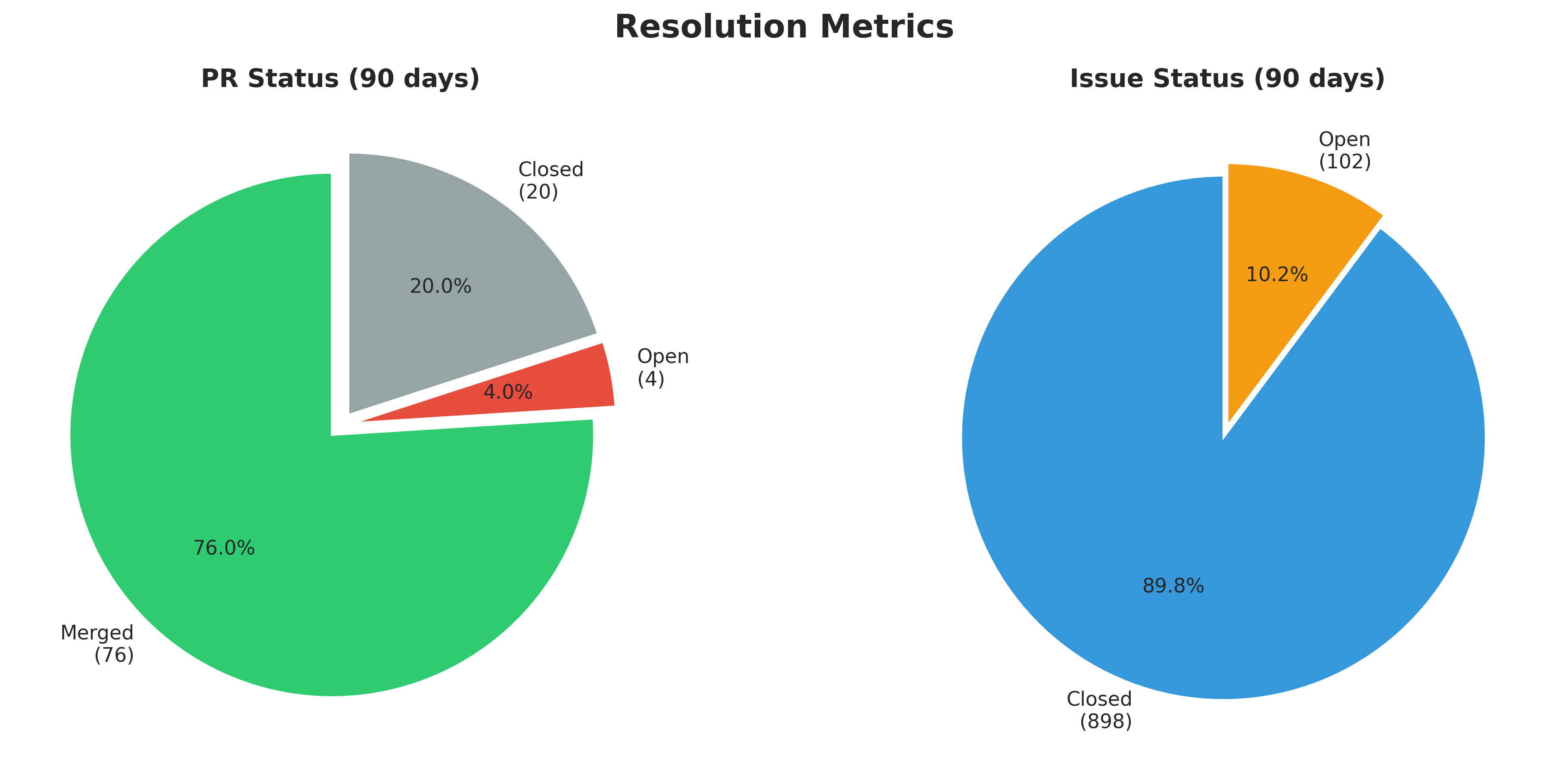The PR merge rate of 76% shows strong throughput with only 4 PRs currently open. The issue closure rate of 89.8% indicates the team is keeping technical debt and open work items under control with prompt follow-through.
